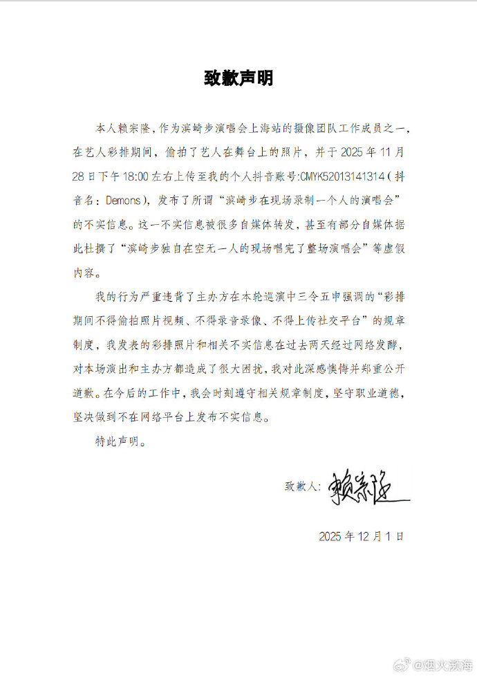 本人赖宗隆,作为滨崎步演唱会上海站的摄像团队工作成员之一,在艺人彩排期间,偷拍了艺人在舞台上的照片,并于2025年11月28日下午18:00 左右上传至我的个人抖音账号:CMYK52013141314(抖音名:Demons),发布了所谓“滨崎步在现场录制一个人的演唱会”的不实信息。这一不实信息被很多自媒体转发,甚至有部分自媒体据此杜撰了“滨崎步独自在空无一人的现场唱完了整场演唱会”等虚假内容。